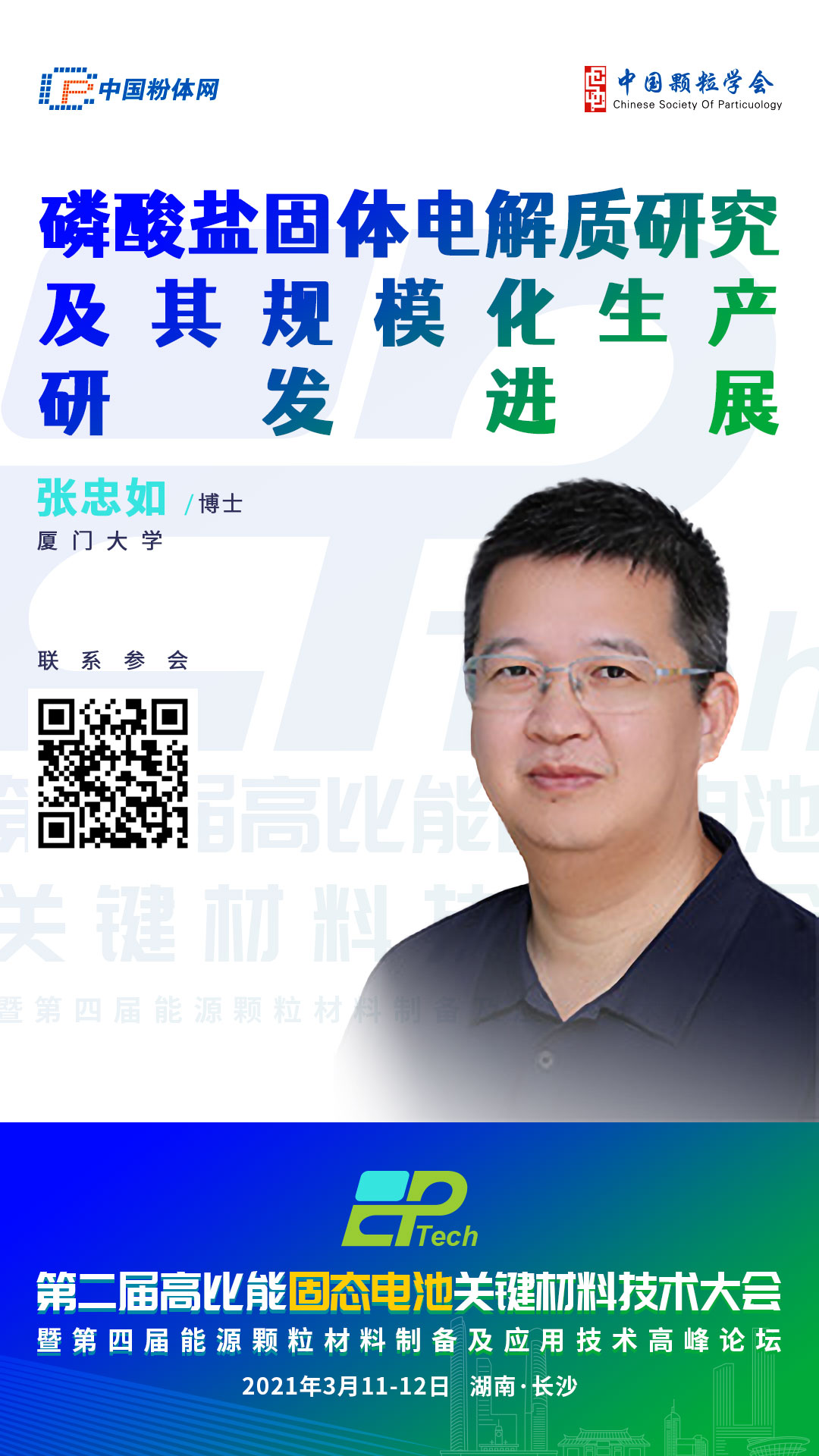 2021年3月11-12日,由中國粉體網(wǎng)、中國顆粒學(xué)會能源顆粒材料專委會主辦,長沙礦冶研究院先進(jìn)材料研究所協(xié)辦的“第二屆高比能固態(tài)電池關(guān)鍵材料技術(shù)大會”將在長沙吉美國際會展酒店隆重舉行,屆時(shí),廈門大學(xué)張忠如博士將帶來報(bào)告《磷酸鹽固體電解質(zhì)研究及其規(guī)模化生產(chǎn)研發(fā)進(jìn)展》,介紹Si摻雜LATP研究以及納米LATP的合成與應(yīng)用。