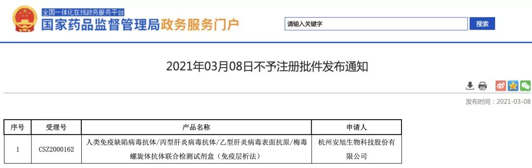 3月8日,國(guó)家藥監(jiān)局政務(wù)服務(wù)門戶發(fā)布了不予注冊(cè)批件發(fā)布通告,杭州安旭生物科技股份有限公司申請(qǐng)的人類免疫缺陷病毒抗體/丙型肝炎病毒抗體/乙型肝炎病毒表面抗原/梅毒螺旋體抗體聯(lián)合檢測(cè)試劑盒(免疫層析法)不予注冊(cè)。