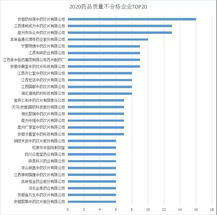 2020年藥品質(zhì)量不合格企業(yè)居榜首的為安徽藥知源中藥飲片有限公司;其次是江西樟樹(shù)成方中藥飲片有限公司和亳州市華云中藥飲片有限公司,更多詳情可見(jiàn)下圖: