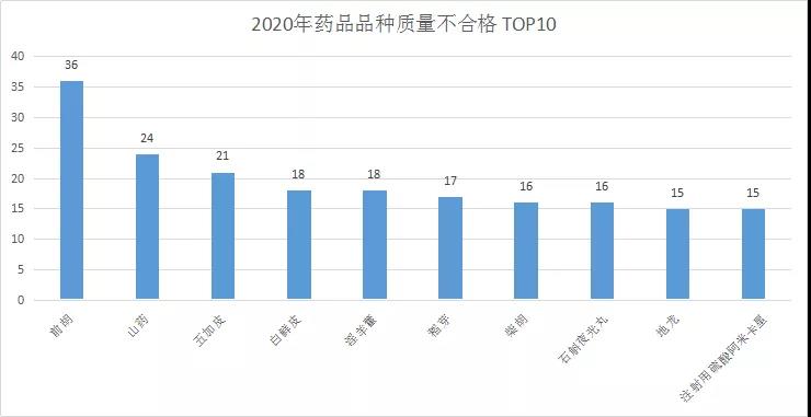 從藥品品種類型看,2020年藥品質(zhì)量不合格多以中藥材為主,前10名中中藥材8種,中成藥與化藥各有一種。