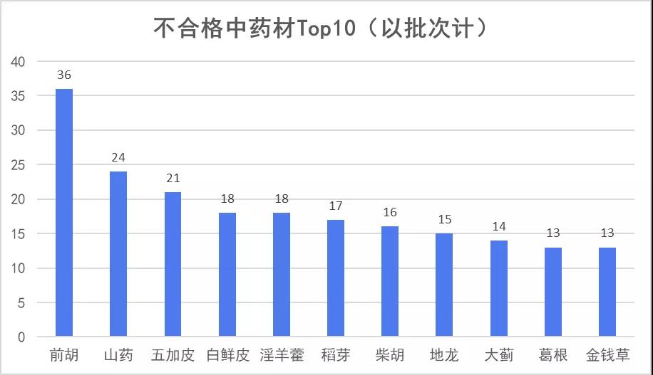 另?yè)?jù)統(tǒng)計(jì),中藥材不合格品種前10位中“前胡”以36批次占據(jù)榜首,“山藥”“五加皮”“白鮮皮”“淫羊藿”分列2至5名。