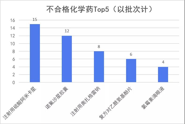 化藥不合格品種排在前5名的分別是“注射用硫酸阿米卡星”“諾佛沙星膠囊”“注射用奧扎格雷鈉”“復(fù)方對(duì)乙酰氨基酚片”“氯霉素滴眼液”,這其中“注射用硫酸阿米卡星”與“諾佛沙星膠囊”不合格批次超過(guò)了10批次,值得引起注意。