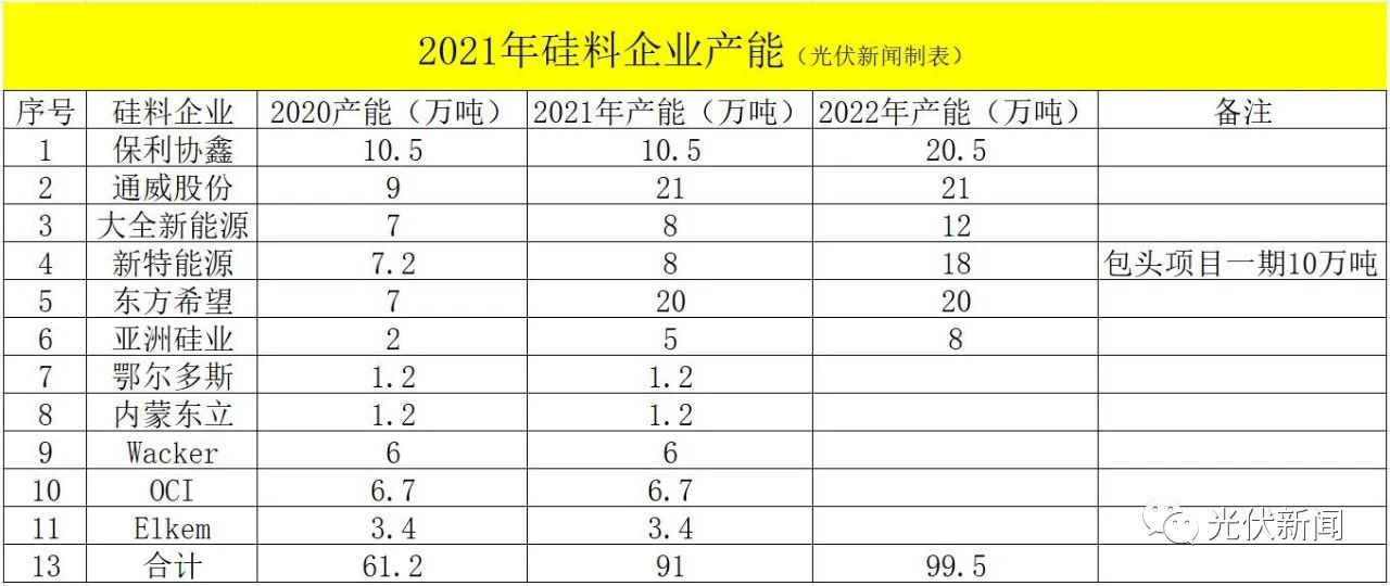 4、新特能源:目前8萬噸產(chǎn)能,包頭項(xiàng)目一期10萬噸產(chǎn)能預(yù)計(jì)將于2022年建成投產(chǎn);包頭項(xiàng)目二期也有10萬噸產(chǎn)能;