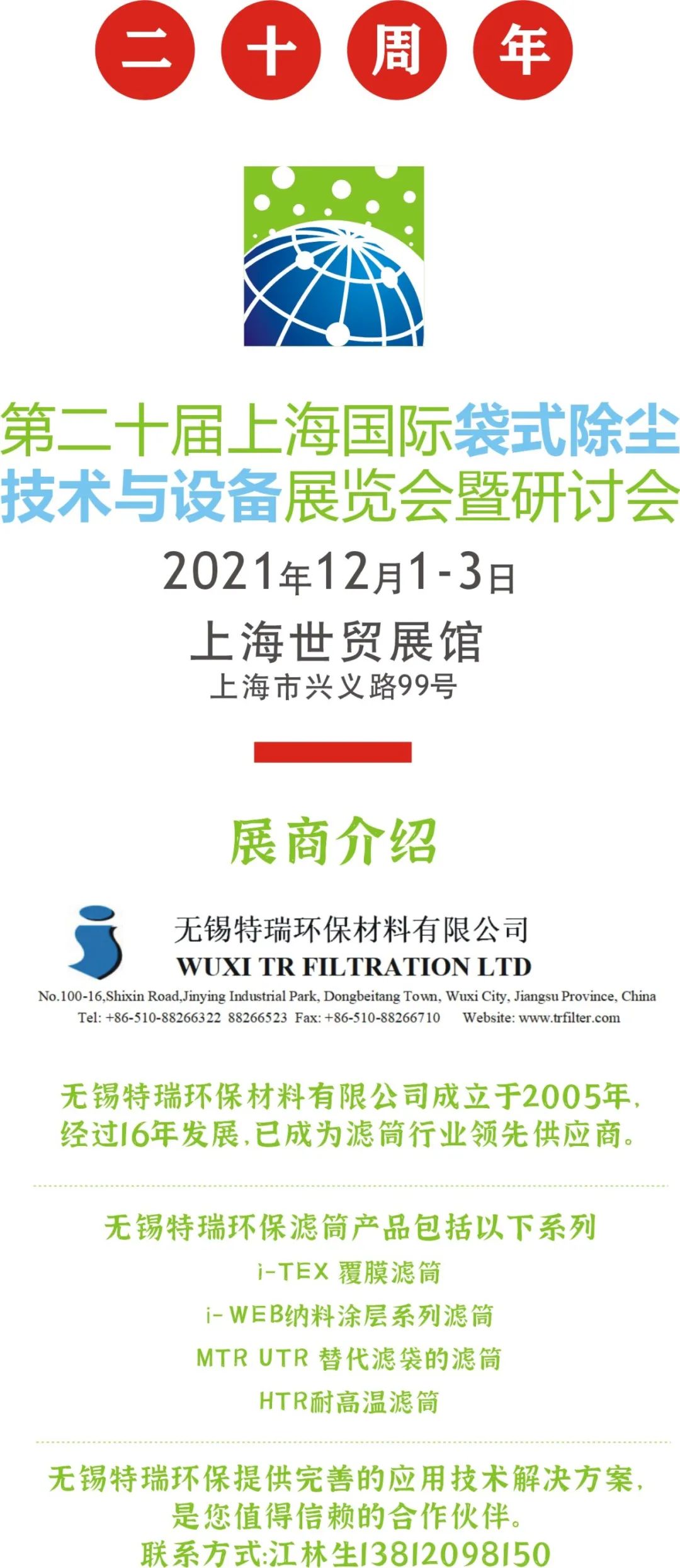 2021第二十屆上海國際袋式除塵技術(shù)與設(shè)備展覽會暨研討會,將于12 月1-3 日在上海世貿(mào)展館隆重舉辦。無錫特瑞環(huán)保材料有限公司將攜除塵濾筒、濾袋產(chǎn)品亮相。