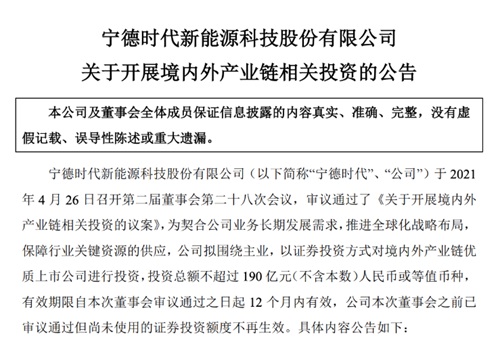 同日,寧德時(shí)代發(fā)布公告,公司擬圍繞主業(yè),以證券投資方式對境內(nèi)外產(chǎn)業(yè)鏈優(yōu)質(zhì)上市公司進(jìn)行投資,投資總額不超過190億元(不含本數(shù))人民幣或等值幣種。
