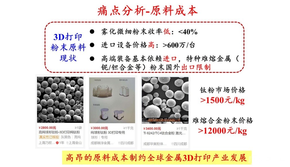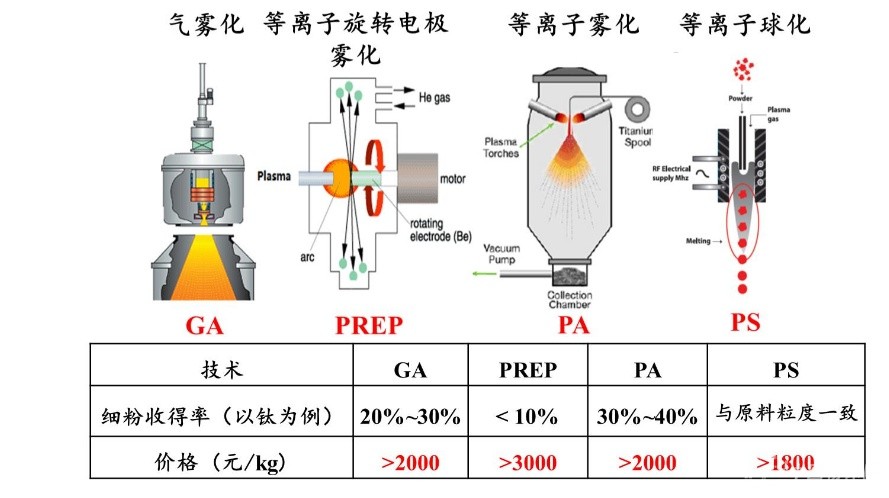 接下來曲教授科普了幾種球形粉末制備技術(shù),如氣霧法、等離子旋轉(zhuǎn)電極霧化、等離子霧化和等離子球化。并以金屬鈦為例,講明了幾種方法下細分收得率與價格,尤其是對原料成本進行了詳細的分析,并指出制備成本是影響其應(yīng)用發(fā)展的一大因素。
