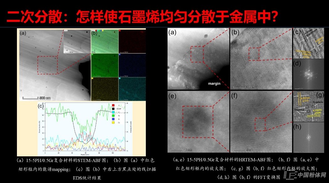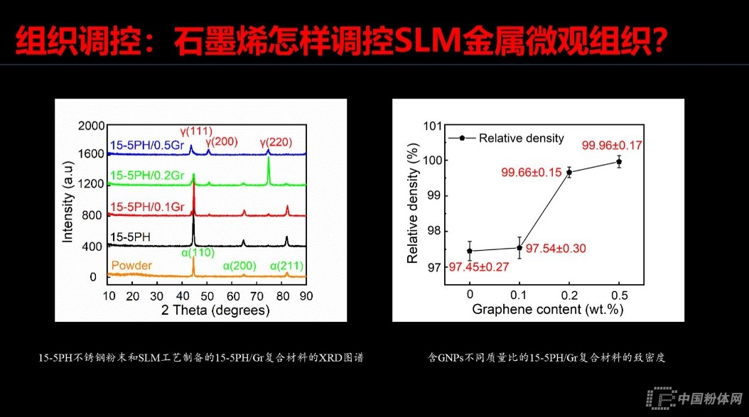在報告最后,張效迅副教授在總結(jié)時談到3個新現(xiàn)象,那就是:通過行星球磨可以使多層GNPs變成少層GNPs;GNPs在15-5PH選區(qū)激光熔化過程中具有二次分散現(xiàn)象;GNPs加入馬氏體不銹鋼15-5PH可以調(diào)控期組織,轉(zhuǎn)變?yōu)閵W氏體不銹鋼。