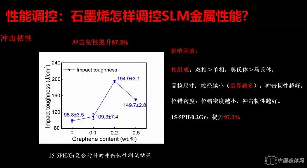 據(jù)此,張效迅副教授總結(jié)出兩條新規(guī)律:隨著石墨烯含量的增加,15-5PH中奧氏體增加,石墨烯含量在0.5%時馬氏體不銹鋼15-5PH全部轉(zhuǎn)變?yōu)閵W氏體不銹鋼;在保持高強度的同時,石墨烯增強了15-5PH不銹鋼的延展性,(提升130.9%),沖擊韌性(提升97.3%),和耐磨性(摩擦系數(shù)降低45.2%)。