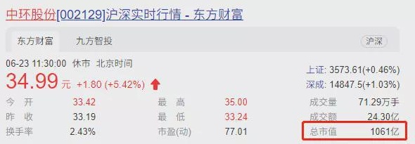 6月21日,中環(huán)股份股票市值重新突破1000億元大關(guān),并且仍在持續(xù)增長。截至今日(6月23日)中午休市,中環(huán)股份股票報34.99元/股,漲幅5.42%,總市值達(dá)到1061億元。