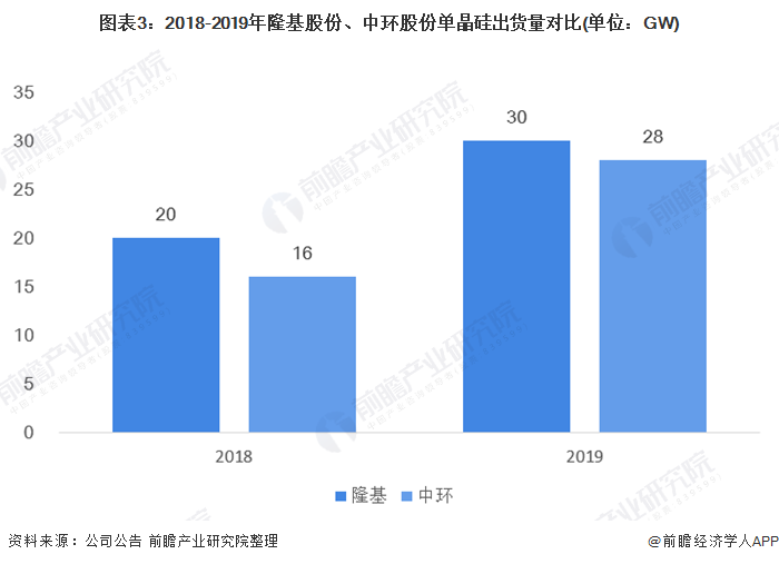 從單晶硅的出貨量來(lái)看,2018-2019年,隆基股份的出貨量略大于中環(huán)股份。2019年,隆基股份單晶硅的出貨量為30GW,中環(huán)股份的出貨量為28GW,隆基股份高出約2GW。