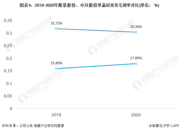 從核電業(yè)務(wù)的毛利率來(lái)看,2019-2020年,隆基股份的單晶硅業(yè)務(wù)毛利率均高于中環(huán)股份;從毛利率變化趨勢(shì)來(lái)看,隆基股份的單晶硅業(yè)務(wù)毛利率總體下滑,而中環(huán)股份的毛利率不斷提升。2020年,兩家龍頭單晶硅企業(yè)的單晶硅業(yè)務(wù)毛利率差距較2019年大幅縮小。