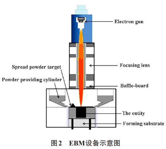 EBM技術(shù),其技術(shù)原理為: 采用電子束焊接工藝在真空環(huán)境中,熔化金屬粉末材料,然后按照設(shè)定的路徑逐層堆積而成形出金屬制件。通過EBM技術(shù)可以成形結(jié)構(gòu)復(fù)雜、成分純度高的金屬零件,但是其成形尺寸受到了粉體環(huán)境與車床的限制。設(shè)備示意圖見圖2。