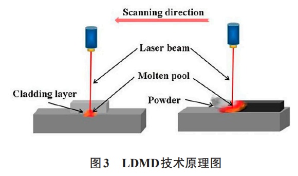 LDMD技術(shù)也稱為激光堆焊技術(shù),早在二十世紀(jì)六十年代就被提出,通過使用高能激光在兩個金屬材料表層之間形成熔覆層,然后經(jīng)快速固化得到性能良好的涂覆層。但是受到工藝與殘余應(yīng)力等影響,熔覆層常常存在缺陷,在成形精度、成本等方面仍有不足。技術(shù)原理圖見圖3。