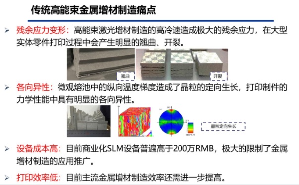 由于中國市場對金屬材料 3D 打印的接受度仍處于初期階段,3D 打印技術(shù)在中國生產(chǎn)制造行業(yè)的滲透率的確還遠(yuǎn)不如美國、德國等國家。傳統(tǒng)高能束金屬增材制造痛點如下圖: