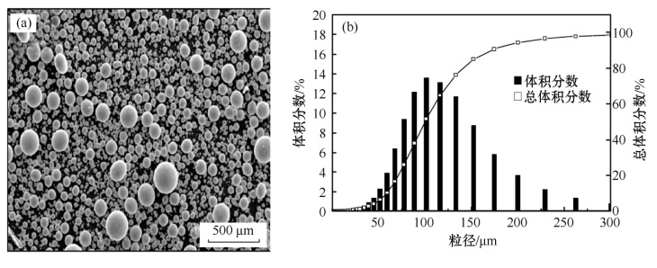 以EIGA法制備TC4合金粉末為例,粒徑分布主要在1~180μm范圍,EIGA法制備粉末主要為球形和近球形粉末,通過調(diào)整功率等工藝參數(shù),細(xì)粉收得率可高達(dá)到82%,粉末球形度高達(dá)99%,滿足激光3D打印對(duì)粉末粒徑的要求;此外,EIGA法制備金屬粉末通常效率高、能耗較低,但感應(yīng)線圈對(duì)電極尺寸的限制制約了大直徑電極材料霧化技術(shù)的發(fā)展,同時(shí)熔煉時(shí)電極的偏析會(huì)一定程度上造成合金粉末成分不均,制備粉末時(shí)“傘效應(yīng)”會(huì)導(dǎo)致粉末整體粒徑分布較寬,顆粒存在較多的“衛(wèi)星粉”、異形粉和空心粉,進(jìn)而導(dǎo)致粉末流動(dòng)性下降,松裝密度及振實(shí)密度較低,此外,EIGA法制備粉末還普遍存在易粘結(jié)、孔隙率高等問題。圖1為EIGA法制備TC4合金粉末SEM照片及粉末粒徑分布圖。