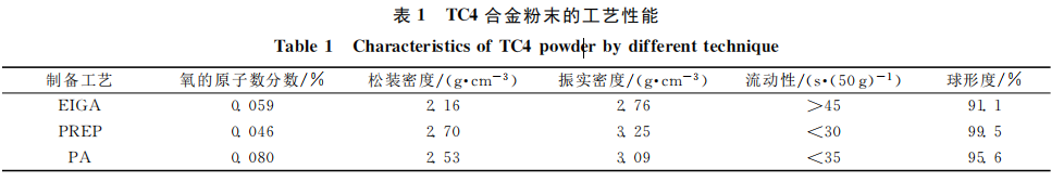 表1為EIGA、PREP及PA法制備TC4合金粉末的工藝性能對(duì)比。
