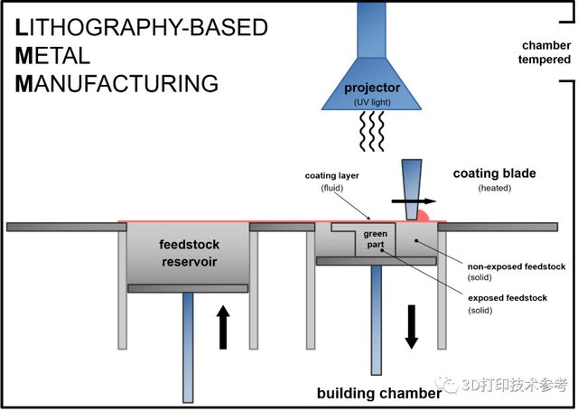 LMM技術(shù)根據(jù)光聚合原理生產(chǎn)高精度零件生坯,其原料為金屬粉末和光敏聚合物的混合體。通過(guò)掩模曝光,可以精確快速地成型整個(gè)層面,聚合物粘結(jié)劑選擇性的在局部交聯(lián),將金屬粉末粘結(jié)在一起。打印完的生坯經(jīng)歷脫脂和燒結(jié)后可以形成致密化的零件。