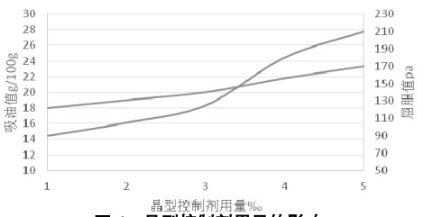 碳化反應包括碳酸鈣晶核的生成和晶體的長大,在碳化反應初期,隨著晶型控制劑用量的增加,成核速率大于成長速率,制得的納米碳酸鈣粒徑小,比表面積大,屈服值高,但吸油值也相應升高。