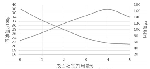 隨著表面處理劑用量的增大,納米碳酸鈣的吸油值不斷下降。但當處理劑用量增加到一定程度后,吸油值幾乎不再下降,而且體系中過量的處理劑導致屈服值降低。