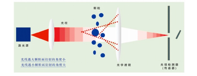 激光衍射法粒度分析常用的儀器是激光粒度分析儀,由分析儀產(chǎn)生的經(jīng)光路變換為平面波的單色平行光,在通過樣品時(shí)發(fā)生衍射、散射,相同粒徑所產(chǎn)生的衍射、散射光落在相同的位置上,并由布置在不同方向的光電探測(cè)器接收;然后探測(cè)器將衍射、散射信息傳給計(jì)算機(jī);通過計(jì)算在不同方向所獲取的光位置和強(qiáng)度信息可得出樣品中不同粒級(jí)的體積分?jǐn)?shù)和顆粒體積,根據(jù)等效圓球理論(米氏理論)換算出樣品顆粒的粒度分布。