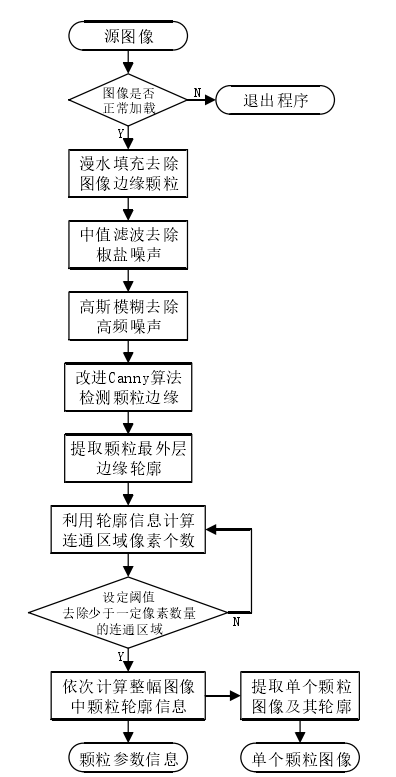 顆粒圖像處理算法對(duì)采集的顆粒圖像首先利用漫水填充方法去除與圖像邊緣接觸的顆粒;然后利用中值濾波去除圖像中的椒鹽噪聲、利用高斯模糊對(duì)圖像進(jìn)行平滑濾波;通過改進(jìn)Canny 邊緣檢測(cè)算法檢測(cè)顆粒邊緣;最后提取每個(gè)顆粒最外層邊界輪廓。利用提取的顆粒邊緣輪廓信息計(jì)算顆粒粒度粒形參數(shù),同時(shí)將小于一定閾值的顆粒去除,最終保存圖像中所有有效顆粒的參數(shù)信息和單個(gè)顆粒原始圖像及其輪廓圖像。