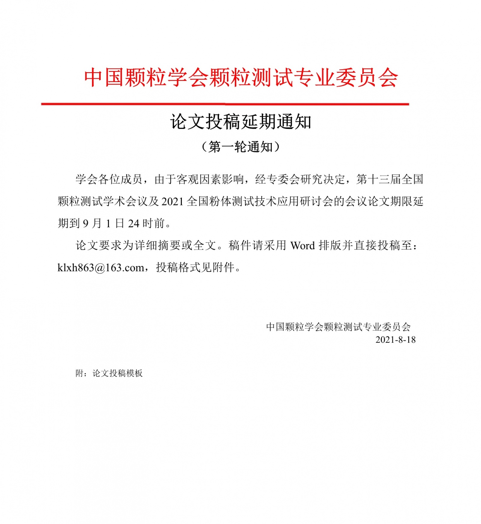 學(xué)會(huì)各位成員,由于客觀因素影響,經(jīng)專委會(huì)研究決定,第十三屆全國(guó)顆粒測(cè)試學(xué)術(shù)會(huì)議及2021全國(guó)粉體測(cè)試技術(shù)應(yīng)用研討會(huì)的會(huì)議論文期限延期到9月1日24時(shí)前。