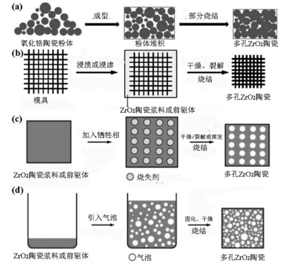 依據(jù)造孔機理的不同,可將ZrO2多孔陶瓷的制備方法分為以下四類:即顆粒堆積法、模板復(fù)制法、犧牲模板法和直接發(fā)泡法。通常,制備ZrO2 陶瓷的過程包括陶瓷顆粒均勻混料、素坯成型、素坯干燥和多孔陶瓷燒結(jié)等環(huán)節(jié)。