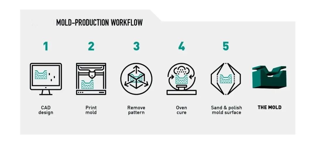 Massivit 3D的CIM技術(shù)可以直接生產(chǎn)鑄造陰模,從而消除了生產(chǎn)初始母模的需要。這將原有工作流程整合為以下幾個步驟,簡化了生產(chǎn)流程。此外,CIM技術(shù)還為復(fù)雜設(shè)計提供了卓越的幾何自由度。