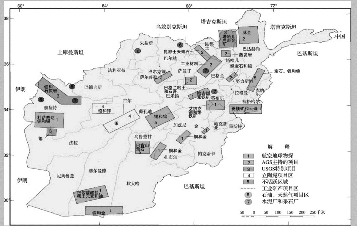 阿富汗主要礦業(yè)項(xiàng)目分布和勘探情況示意圖(楊怒等.2012)