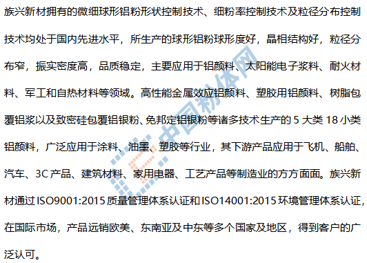 長沙族興新材料股份有限公司(族興新材)位于湖南省長沙市金洲新區(qū),擁有微細(xì)球形鋁粉和鋁顏料生產(chǎn)的7大核心技術(shù),24項授權(quán)發(fā)明專利和17項實(shí)用新型專利,主持制定3個鋁顏料行業(yè)標(biāo)準(zhǔn),參與制定2個鋁顏料行業(yè)標(biāo)準(zhǔn)和3個涂料行業(yè)國家標(biāo)準(zhǔn),專業(yè)從事微細(xì)球形鋁粉和片狀功能粉體材料的研發(fā)和生產(chǎn)經(jīng)營,是微細(xì)球形鋁粉和鋁顏料行業(yè)中的知名企業(yè)。
