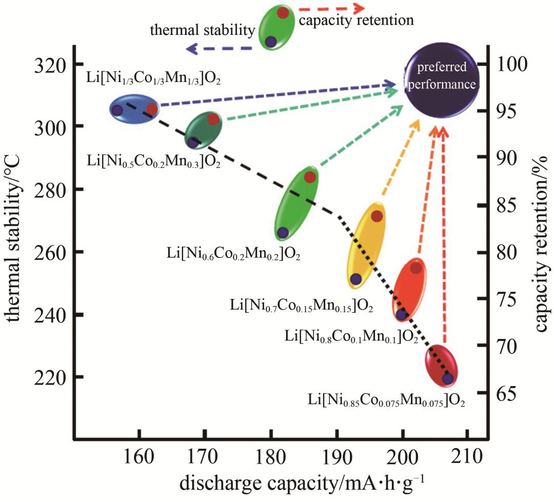 ▲不同Ni含量NCM的放電比容量、熱穩(wěn)定性和容量保持率關(guān)系圖