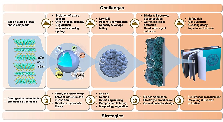 ▲富鋰錳基正極材料從晶體結(jié)構(gòu)到實(shí)際應(yīng)用各個(gè)階段面臨的挑戰(zhàn)和策略概述。