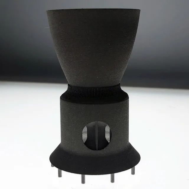 △使用鎢-錸3D打印的固體火箭發(fā)動機(jī)噴嘴的無侵蝕性核心插件。照片來自6K增材公司