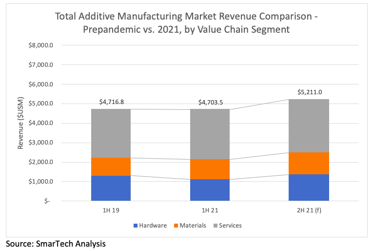 硬件銷售在2021上半年有明顯反彈,材料和服務(wù)銷售也是如此,這體現(xiàn)了整體市場強勁復(fù)蘇,而不僅僅是表面的“反彈”動態(tài)。包括打印機、材料和第三方3D打印服務(wù)在內(nèi)的整個增材市場在2021年上半年創(chuàng)造了約47億美元(約304億人民幣)的收入,與2019年上半年的收入大致相同。SmarTech預(yù)計整個市場在今年下半年將實現(xiàn)更大的增長行業(yè),尤其是Desktop Metal集團和3D Systems等公司。