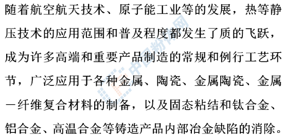 熱等靜壓技術(shù)目前不僅在鑄件處理、粉末冶金、陶瓷工業(yè)中應(yīng)用,還在多孔材料、近凈成形、材料粘結(jié)、等離子噴涂、制造高端石墨等領(lǐng)域應(yīng)用。