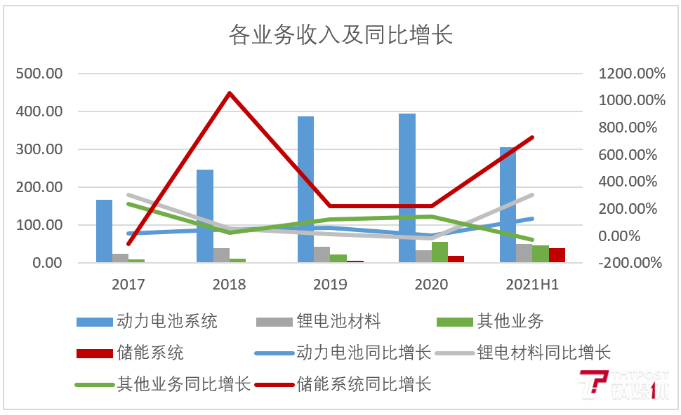 作為拉動營收增長主要的動力電池系統(tǒng)業(yè)務(wù)部分,雖然2021年上半年收入有較大幅度增長,但其對營收的貢獻(xiàn)比例下降至69.09%, 鋰電材料與儲能系統(tǒng)對營收貢獻(xiàn)率均超過10%。
