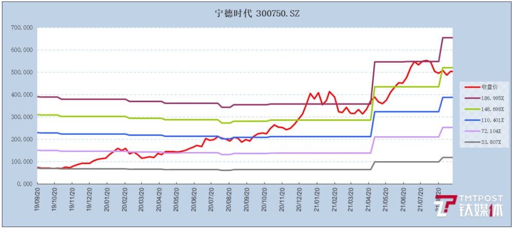考慮到公司未來的成長性,我們用PEG方法對公司股價進(jìn)行一下分析,可以看到公司PE(TTM)從2020年以來保持了快速的增長,目前PE較7月份有所下降,目前在144左右,公司2021年上半年凈利潤增速為148.38%, 如果僅是根據(jù)上半年凈利潤增速來看,PEG小于1,以目前凈利潤的增速是對股價有支撐的,但是考慮到未來三五年內(nèi)公司凈利潤維持如此高的增速基本是很困難的,這也就說明市場目前對公司的估值其實(shí)是相當(dāng)樂觀的,或許寧德時代已經(jīng)考慮到這一點(diǎn),而目前積極開發(fā)鈉電池,尋找新的利潤增長點(diǎn)正是主要的應(yīng)對措施之一。