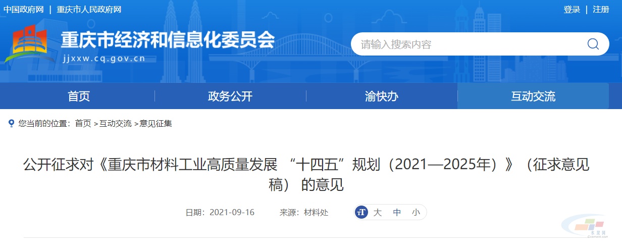 近日,重慶發(fā)布公開(kāi)征求對(duì)《重慶市材料工業(yè)高質(zhì)量發(fā)展 “十四五”規(guī)劃(2021—2025年)》(征求意見(jiàn)稿) 的意見(jiàn)。