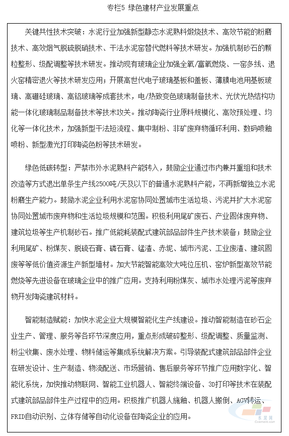 以做優(yōu)做精先進(jìn)基礎(chǔ)材料為產(chǎn)業(yè)重點(diǎn)方向,以發(fā)展節(jié)能環(huán)保、安全耐久的綠色建材為目標(biāo),以高技術(shù)含量、高附加值產(chǎn)品為主攻方向,重點(diǎn)構(gòu)建名企匯集、上下貫通、集約集聚的裝配式建筑產(chǎn)業(yè)鏈。支持水泥龍頭企業(yè)延伸產(chǎn)業(yè)鏈,拓展水泥制品應(yīng)用領(lǐng)域和范圍,積極發(fā)展預(yù)拌砂漿、高性能混凝土、功能化混凝土等下游產(chǎn)品。砂石產(chǎn)業(yè)有序布局一批千萬(wàn)噸級(jí)大型機(jī)制砂石生產(chǎn)保障基地,彌補(bǔ)當(dāng)前砂石供需失衡缺口。建立并逐步完善機(jī)制砂石產(chǎn)品及應(yīng)用標(biāo)準(zhǔn)規(guī)范體系,不斷提高優(yōu)質(zhì)和專用產(chǎn)品應(yīng)用比例。