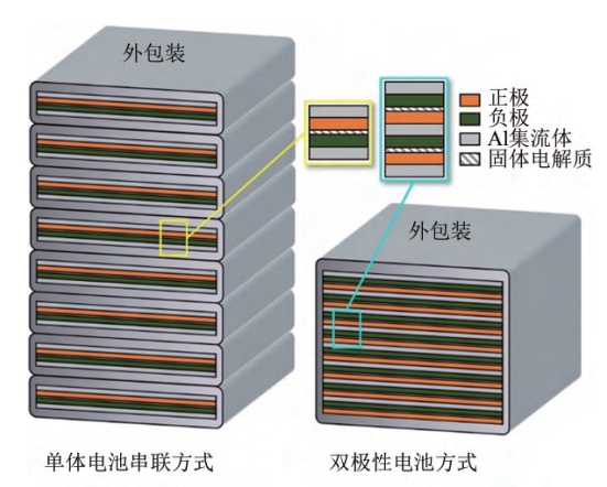 圖2 分別使用單體電池串聯(lián)和雙極性電池方式成組的固態(tài)鈉電池(相同電壓和容量)