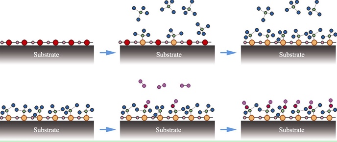 原子層沉積的表面反應(yīng)具有自限制性,這種自限制性特征是原子層沉積技術(shù)的基礎(chǔ)。不斷重復(fù)這種自限制反應(yīng)就形成所需要的薄膜。根據(jù)沉積前驅(qū)體和基體材料的不同,原子層沉積的自限制特征分為兩種不同的機(jī)制,即化學(xué)吸附自限制(CS)和順次反應(yīng)自限制(RS)過程。化學(xué)吸附自限制沉積過程中,第一種反應(yīng)前驅(qū)體輸入到基體材料表面并通過化學(xué)吸附(飽和吸附)保持在表面。當(dāng)?shù)诙N前驅(qū)體通入反應(yīng)器,就會(huì)與已吸附于基體材料表面的第一前驅(qū)體發(fā)生反應(yīng)。兩個(gè)前驅(qū)體之間發(fā)生置換反應(yīng),并產(chǎn)生相應(yīng)的副產(chǎn)物,直到表面的第一前驅(qū)體完全消耗,反應(yīng)會(huì)自動(dòng)停止,并形成需要的原子層(如圖 1 所示)。因此這是一種自限制過程,而且不斷重復(fù)這種反應(yīng)形成薄膜。