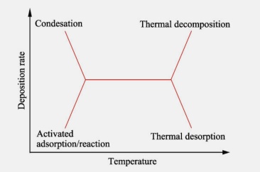 原子層沉積的另一特征是其窗口溫度較寬,ALD薄膜在較低的溫度范圍內(nèi)(150~300 ℃)生長速度會(huì)隨著溫度的升高而增加。隨著溫度的升高,會(huì)出現(xiàn)一個(gè)“ALD 窗口”,這時(shí)的沉積速率不再隨溫度變化,而趨于恒定,如圖 3 所示。