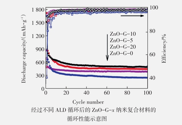 ALD技術(shù)應(yīng)用于鋰離子電池負(fù)極材料的制備,比如將ZnO和Al2O3依次沉積在石墨烯上作為鋰離子電池負(fù)極材料,在圖4中可以看到,Al2O3包覆的材料有效地抑制材料在充放電前10個(gè)循環(huán)中發(fā)生的容量衰減。在經(jīng)過100個(gè)循環(huán)之后,包覆效果最好的材料比容量約為原始材料的2倍。在這種材料中,Al2O3和ZnO緊密地貼合在石墨烯骨架上,石墨烯為材料提供了導(dǎo)電網(wǎng)絡(luò),同時(shí)Al2O3形成的保護(hù)層避免了ZnO的脫落從而保證了材料優(yōu)良的電化學(xué)性能。這也顯示了ALD技術(shù)形成的Al2O3層的良好的機(jī)械性能。