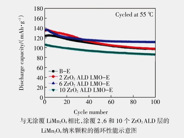 ALD技術(shù)不僅應(yīng)用于鋰離子電池材料的合成,還在材料的改性研究中發(fā)揮了巨大作用。例如,將約1.2nm的ZrO2沉積在LiMn2O4表面得到了改性的鋰離子電池的正極材料(如圖5和圖6)。