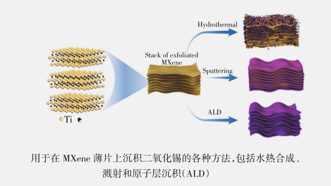 除了以上提到的鋰離子電池正極材料,在負(fù)極材料改性方面ALD技術(shù)也得到廣泛研究。通過ALD技術(shù)將SnO2均勻地沉積在Ti3C2MXene上,此技術(shù)的使用保證了MXene結(jié)構(gòu)的完整性,進(jìn)而使得本身具有高理論容量的MXene的電化學(xué)性能進(jìn)一步提升。從圖7中可以看出,相比于其他化學(xué)方法,ALD改性顯示出更好的效果:水熱反應(yīng)的高溫、高壓的環(huán)境會(huì)破壞MXene的二維結(jié)構(gòu),而普通的濺射沉積只能修飾MXene的最外層。
