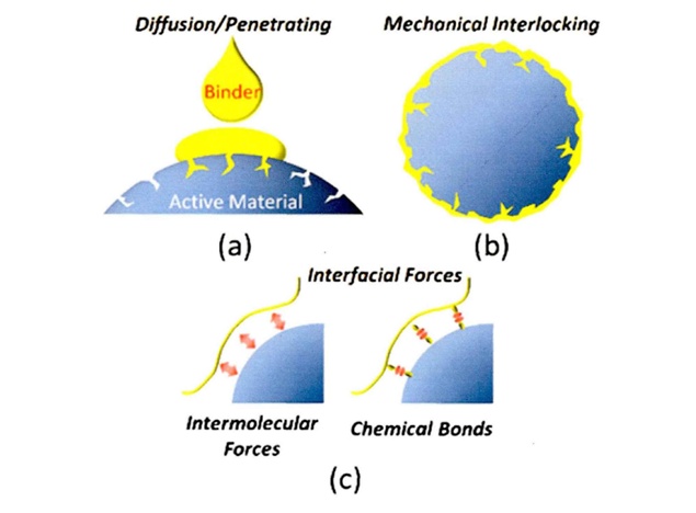 目前粘結(jié)劑的工作機(jī)理主要可以分為浸潤(rùn)理論、機(jī)械互鎖理論、吸附理論、擴(kuò)散理論、靜電理論和弱邊界層理論。這些理論都具有各自的優(yōu)缺點(diǎn),有各自可以很好解釋的粘結(jié)現(xiàn)象,也有各自無(wú)法解釋的現(xiàn)象。在粘結(jié)過(guò)程中,這些理論是可以相輔相成,協(xié)同作用的。其中在鋰離子電池粘結(jié)劑中,浸潤(rùn)理論、機(jī)械互鎖理論和吸附理論是被廣泛應(yīng)用于粘結(jié)劑和活性物質(zhì)之間的粘結(jié)進(jìn)行解釋的三種理論,也被認(rèn)為是三種最主要的理論。