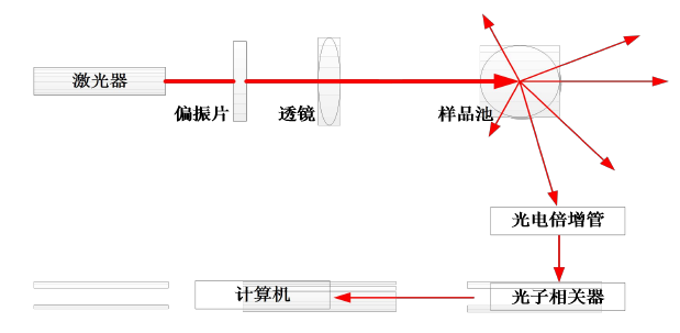 測量原理:分散在液體中的納米顆粒的布朗運(yùn)動使得散射光隨時間而波動,對散射光信號做自相關(guān)運(yùn)算得到光強(qiáng)自相關(guān)函數(shù),通過計(jì)算相關(guān)函數(shù)的衰減時間,得到平移擴(kuò)散系數(shù),進(jìn)而計(jì)算出顆粒的粒徑。下圖是動態(tài)光散射顆粒測量原理圖。