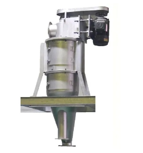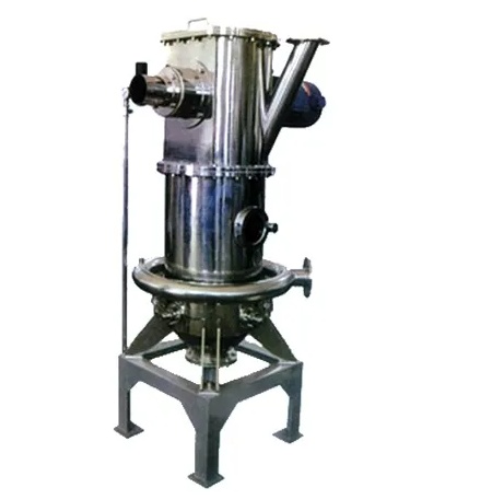 原料從進(jìn)料口加入后,落在分級(jí)轉(zhuǎn)子的分散板處,在離心力作用下,落入分級(jí)室,在此受導(dǎo)流葉片產(chǎn)生的自由氣流漩渦(1次分級(jí))和高速轉(zhuǎn)子產(chǎn)生的強(qiáng)制氣流漩渦(2次分級(jí))的共同作用,進(jìn)行分級(jí),粗粉落入下部料斗,細(xì)粉導(dǎo)入上部出口排出被收集。