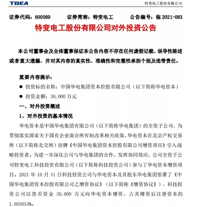 中國粉體網(wǎng)訊 11月1日,特變電工發(fā)布公告,華電資本是中國華電集團有限公司(以下簡稱華電集團)的全資子公司,為貫徹落實國家關(guān)于國有企業(yè)混合所有制改革相關(guān)政策,華電資本在北稱京產(chǎn)權(quán)交易所(以下簡稱北交所)掛牌《中國華電集團資本控股有限公司增資項目》引入戰(zhàn)略投資者。為進一步深化公司與華電集團的合作,發(fā)揮協(xié)同效應(yīng),公司全資子公司特變電工科技投資有限公司(以下簡稱科技投資公司)參與了華電資本增資項目。2021年10月31日科技投資公司與華電資本及其股東華電集團簽署了《中國華電集團資本控股有限公司之增資協(xié)議》(以下簡稱《增資協(xié)議》),科技投資公司以貨幣資金30,000萬元向華電資本增資,占其增資后注冊資本的1.603654%。