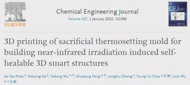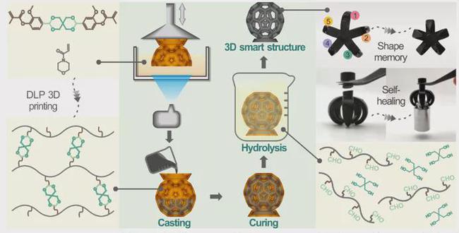 圖:光固化3D打印犧牲熱固性模具用于構(gòu)建近紅外輻射誘導(dǎo)自修復(fù)3D智能結(jié)構(gòu)
